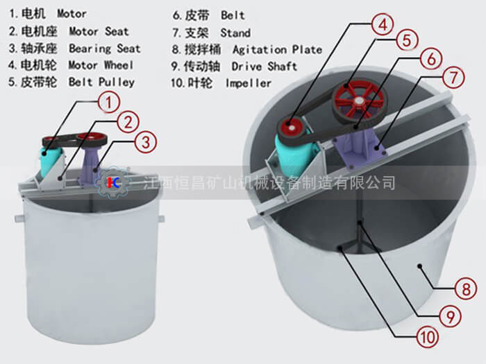 礦用攪拌桶由電機(jī)、電機(jī)座、軸承座、電機(jī)輪、皮帶輪、皮帶、支架、攪拌桶、傳動軸、葉輪等部件組成。