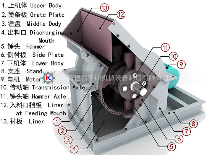 錘式破碎機(jī)由轉(zhuǎn)子、錘頭、傳動軸承、篩板、電機(jī)等部件組成。