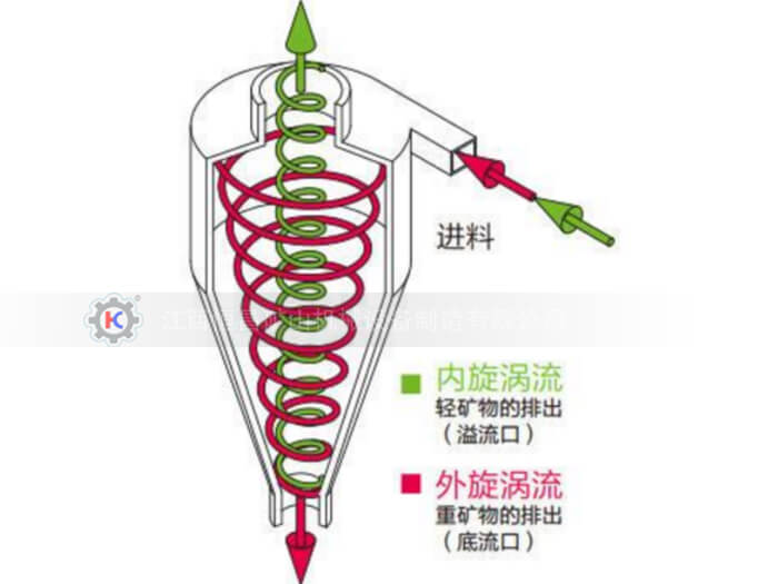 水力旋流器的工作原理是離心沉降原理。當需要分離的礦漿以一定壓力從旋流器周邊切向進入旋流器內(nèi)后,產(chǎn)生強烈的三維橢圓型強旋轉(zhuǎn)剪切湍流運動。由于粗顆粒與細顆粒之間存在粒度差,其受到離心力、向心浮力、流體曳力等大小不同,受離心沉降作用,大部分粗顆粒經(jīng)旋流器底流口排出,而大部分細顆粒由溢流管排出,從而達到分離分級目的。