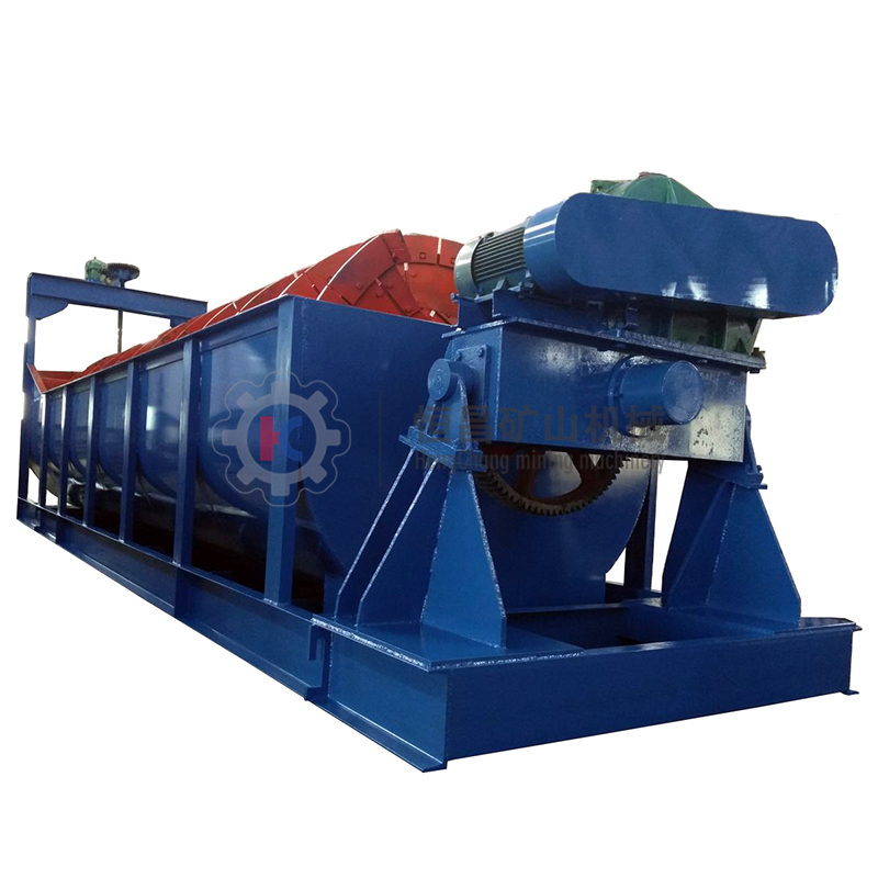 The water tank of this machine is installed obliquely. The angle of inclination is determined according to equipment configuration of equipment in the process flow. The (left, right) spirals driven by the transmission mechanism rotates in the water tank. The finely grained slurry enters the water bank from the feed inlet at one side and forms one slurry precipitation zone, whose surface area and volume depends on the value of the water tank’s inclination angle and the height of overflow edge. The spirals rotating at a low speed play a certain stirring role. After the slurry is stirred, the light and fine particles float above the surface and overflow from the overflow edge. Then they flow into the next working procedure of ore dressing. The heavy and thick particles sink into the bottom of the water tank and become return sand which is transported by the spirals to the ore discharge mouth for discharge.