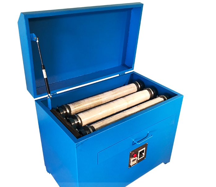 The mill drum is placed on the rubber roller on the top of the main body. The drive motor enables the drive rollers to get four-grade rotate speed, through speed reduction of the two-grade V-belt pulley. Since the mill drum is placed on the roller, it rolls on the drive roller and driven roller under the action of frictional force, getting the steel bar in the mill drum to produce impacting and grinding effects so that the materials can be grinded. Through the adjustment of the two support bolts of bearing pedestal, appropriate tightness of the two-grade belts can be kept to ensure stable rotating speed.