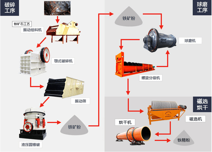 鐵礦石的破碎流程及工藝:鐵礦石是鋼鐵生產(chǎn)企業(yè)的重要原材料,天然礦石(鐵礦石)經(jīng)過(guò)破碎、磨碎、磁選、浮選、重選等程序逐漸選出鐵。